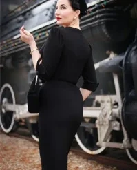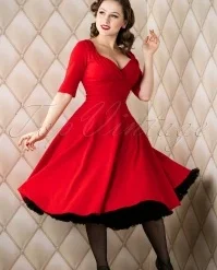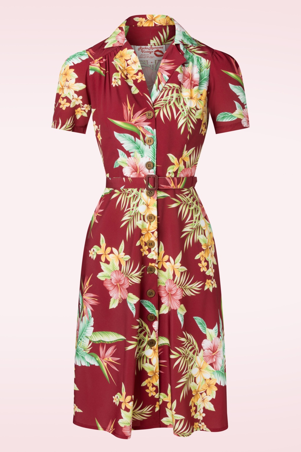 This 50s Charlene Honolulu Shirtwaister Dress in Burgundy will have you feeling fab the moment you pop it on! A beauty with an iconic vintage look thanks to the elegant lapel collar, short puff sleeves, row of wooden buttons, detachable belt and flattering semi-swing style. Made of a supple and breezy, burgundy-red fabric (doesn’t stretch!) scattered with colourful tropical flowers that has the look and feel of 1950s Crepe. Worn casual or styled to a full fifties look, Charlene is always the perfect choice!