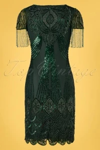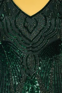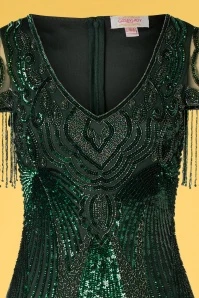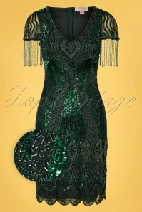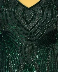 This 20s Marta Flapper Dress in Forest Green is a gorgeous hand embellished reproduction of the elegant 1920s flapper dresses! This dress takes you back to romantic and glamorous bygone days! This beauty, a sparkling hair clip in your hair and man candy at your arm… picture perfect! This showstopper is hand embellished with tiny, sparkling glass beads and sequins in dark green, wow! The top features a deep V-neckline and a beaded fringe along the short sleeves. This beauty features a scalloped hemline and a loose-fit style just like the flapper dresses back in the days. She is made of a dark-green, semi-sheer fabric with a light stretch and lined for extra comfort. Now let’s hope your date is as gallant as the men used to be in the olden days 😉