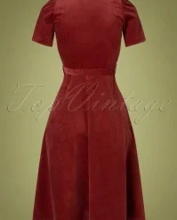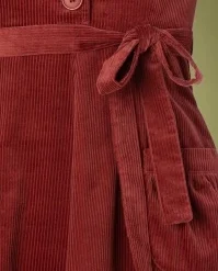 Add some forties flair to your wardrobe with this 40s Midi Revers Dress in Corduroy Marsala! She features a V-neckline with a playful lapel collar, short puff sleeves and a row of large buttons. The sash accentuates your waist, creating a super feminine silhouette. Made of a firm, yet supple and soft, brick-red corduroy cotton (doesn’t stretch) that is a joy to wear. Has she set your vintage-loving heart aflutter? 😉Â