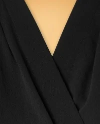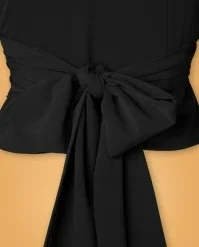 This 50s Darla Wrap Blouse in Black is a real classic! This wrap beauty features elegant knife pleats, long puff sleeves with small cuffs and is fastened with fixed tie straps. Made of a supple, crêpe-like fabric (doesn’t stretch) in black that is a joy to wear. Pair with a pencil skirt or high waist trousers with wide legs for a classy fifties look!