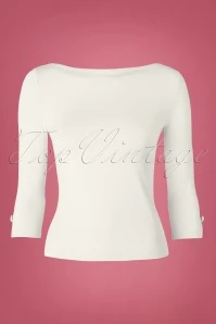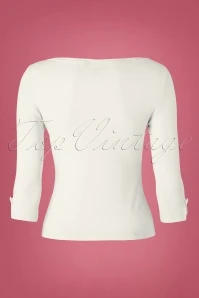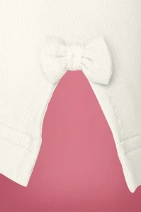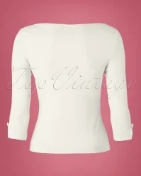 Elegant and cute this 50s Modern Love Top! Simple and yet so elegant due to the adorable detailing! The top features a beautiful boat neck and sleeves finished off with slits and little bows, só cute! Made from a lovely supple, stretchy ivory white viscose blend that will keep its shape, even after a few washes. A versatile classy top which can’t be missed in every vintage lady’s wardrobe!