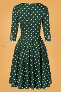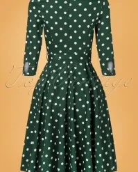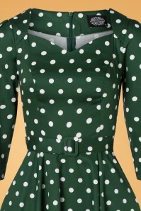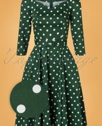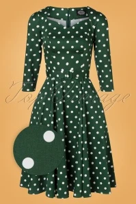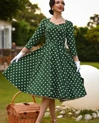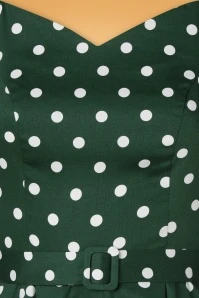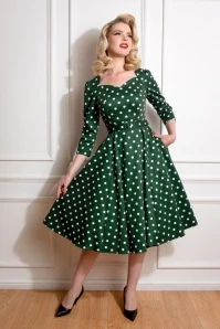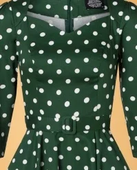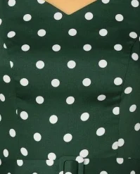 Dazzle them with dots in this 50s Olivia Swing Polkadot Dress in Green and White! 😉 This beauty flaunts a fitted top with a diamond-shaped neckline and flattering ¾ puff sleeves with playful keyholes. The detachable fabric belt and swing skirt create a beautiful feminine silhouette, l-o-v-e! Made of a firm, yet supple, dark-green cotton blend (barely stretches) peppered with white polkadots. With gorgeous Olivia it’s always polkadot o’clock 😉 Â