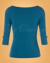 This 50s Oonagh Top in Dark Teal Blue is simple, yet elegant due to the adorable detailing! The top features a beautiful slash neckline and sleeves finished off with slits and little bows, só cute! Made of lovely supple and stretchy cotton in teal blue that will keep its shape, even after a few washes. A versatile, classy top that every vintage lady should have in her wardrobe 😉