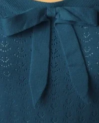 It’s easy to fall in love with this 50s Pointelle Bow Top in Steal Blue! No, this isn’t an illusion… this stunning top is a dream come true!  The top features a beautiful round neckline with a playful bow and 3/4 sleeves, cute! Made of a lovely supple, stretchy, fine knitted, steal blue viscose blend with a classic openwork pattern. A versatile top that every vintage lady should have in her wardrobe!