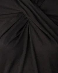 high neckline featuring a little stand collar, an elegant wrap detail and ¾ sleeves.