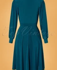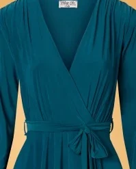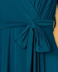 This elegant 50s Trishia Swing Dress in Teal Blue is a genuine vintage beauty, perfect for any occasion! she flaunts a gorgeous wrap neckline, long puffy sleeves with small cuffs and a waist-defining tie belt. From the waist down she runs into a flowy, faux-wrap swing skirt, creating a super feminine silhouette. Made of a smooth and supple, stretchy teal-blue slinky fabric that is a joy to wear and doesn’t crease. You will catch many a favourable look in this beauty! 😉