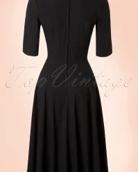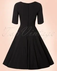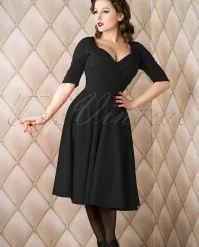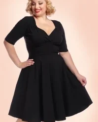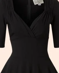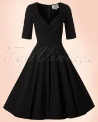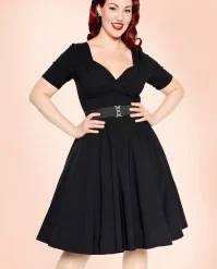Romantic, sexy and classy, this 50s Trixie Doll Swing Dress in Black is super versatile 😉 The gorgeous bodice flaunts playful gathered shoulder seams and a pleated wrap over which is perfect for both a fuller and a more modest cup size, ooh la la! From the waist down she flows into a full circle skirt that can also be paired with a petticoat for a real festive look. Made of a black bengaline fabric with a lovely stretch for a perfect fit. Matched with the right accessories she’s perfect for every occasion!