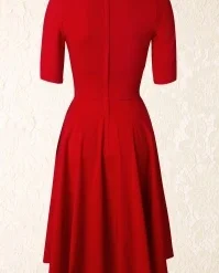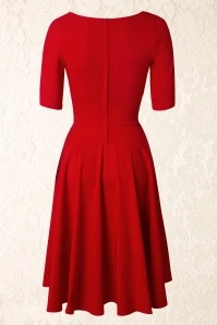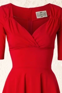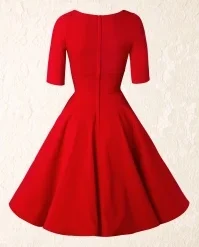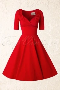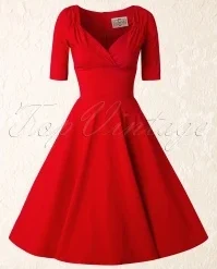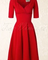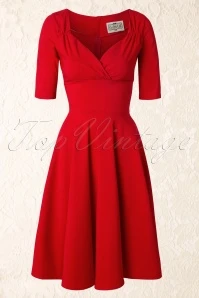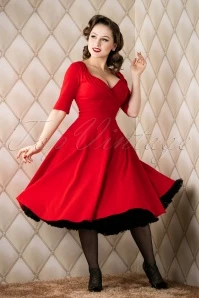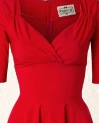 “The lady in red is dancing with me cheek to cheek, there’s nobody here it is just you and me…” you will look and feel like the lady in this love song if you’re wearing this 50s Trixie Doll Swing Dress in Red! Romantic, sexy, classy, this dress is all that and more. The beautiful fitted bodice flaunts 3/4 sleeves and a sexy cleavage with a pleated wrap over which makes her suited for both a fuller and a more modest cup size, ooh la la! From the waist down she flows into a full circle skirt for a feminine silhouette. Made of a supple and stretchy, bright-red fabric that is a dream to wear. Time to put on your dancing shoes!