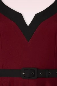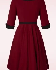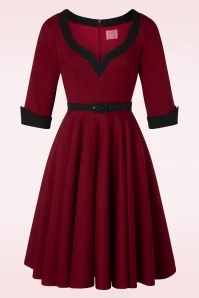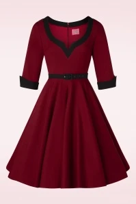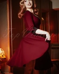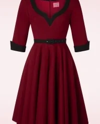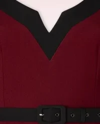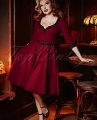 ”It’s better to be looked over than overlooked!” Approving looks, open mouths and twisted necks… get ready to charm the room in this 50s Vivienne Swing Dress in Burgundy Red! This autumn our talented in-house designers have created a collection inspired by the style and charisma displayed by the actresses in the ‘Film Noir’ and ‘Technicolor’ films from the 40s, 50s and 60s! Vivienne is a flirty swing dress flaunting elbow-length sleeves with pointed, black turn-ups and a deep round neckline in black with a sexy v-notch. The slender, detachable black belt draws the eye to your narrowest point… the waist! From there she runs into a flowy full swing skirt with pockets that elegantly sways with