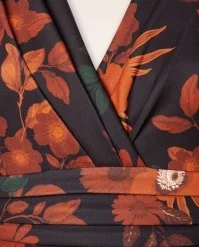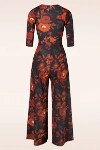 You will want to wear this 70s Liana Floral Jumpsuit in Black and Orange every day! The top features a fixed wrap over, ¾ sleeves and a super flattering, pleated waist band. The flowy, wide legs will make your legs look endless. Orange flowers and green leaves are strewn across a supple and stretchy, black fabric that is a joy to wear. Pair with your favourite accessories to complete the look!