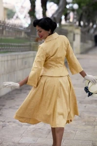 If you like royal chic, you will love this Bronte Sadie Blazer in Sand that was inspired by the flawless style of none other than Queen Elizabeth II. A tribute to the remarkable woman who has taken her place in history not only because of her service to the Commonwealth and United Kingdom, but also for her feminine, elegant style and use of fashion as a powerful communication tool. This blazer is styled with an elegant pointed collar, a V-neckline and ¾ sleeves with a V-notch that are very flattering. Made of a sand-coloured viscose blend with the look and feel of lined and fully lined in a gold-toned satiny fabric for extra comfort. Wear her with the matching swing skirt for a look fit for royalty!