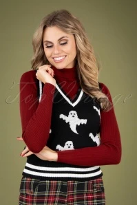 Every day is Halloween isn’t it? For some of us… Create a spooky look with this 50s Ghost Vest in Black! She features a V-neckline, contrasting white stripes, a fabulous ghost design and is made of a soft, knitted, black cotton that is a joy to wear. Pair with a blouse or jeans to create different looks. Creepy, kooky, mysterious, spooky!