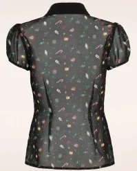 New autumn/winter collection ~ Sleigh all day in our jolly and stylish blouse! 😉 Made of a supple and sheer, black fabric (doesn’t stretch) with festive motifs scattered all over.