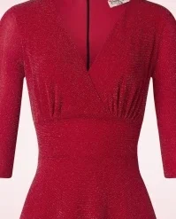 Gloria Glitter Swing Dress in Red, you are the love of my life! She flaunts a pleated surplice neckline, ¾ sleeves, a flattering wide waist band and a flowy swing skirt. Made of a supple and stretchy, deep-red fabric woven with silver-toned glitter. When you love what you have, you have everything you need!