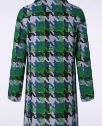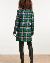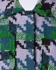 favourite new transitional coat for autumn! She is made of a chunky knit, firm fabric with a touch of wool (doesn’t stretch) flaunting a graphic houndstooth design in purple, green and blue woven with gold-toned Lurex. She is also fully lined in a satiny fabric.
