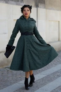 New autumn/winter collection ~ “More than a suit… more than a dress…” Admirable craftsmanship, drama and elegance. The new autumn/winter collection by Miss Candyfloss is inspired by the famous American suit and coat label Lilli Ann! Linette Gia is made of a sturdy and water-repellent, dark-green fabric (doesn’t stretch) flaunting a sassy black leopard print, finished with a shiny satiny lining.