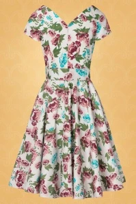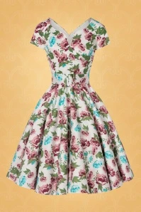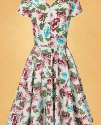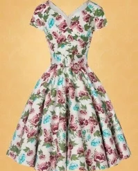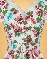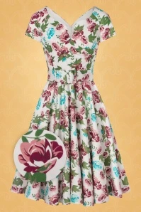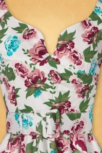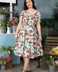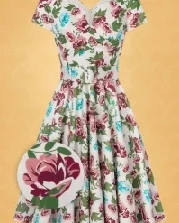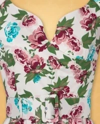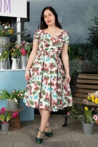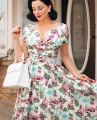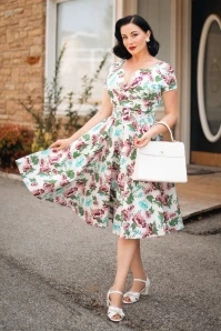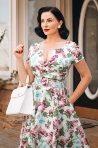 Take a stroll through a wild flower garden in The Bombshell Flower Print Swing Dress in White! This season our in-house designers were inspired by the theme ‘Love is Like a Wild Flower’! Wild flowers are an assemblage of different feelings and textures, just like this new spring/summer collection! The faux-wrap top features a heart-shaped neckline that shows a stunning cleavage without revealing too much. She accentuates your waist thanks to the combination of flattering pleats and the detachable belt. From the waist down she runs into a flowy swing skirt oozing vintage flair. The firm, high quality, white cotton blend with a light stretch is a joy to wear and is adorned with a stunning rose pattern, designed exclusively by Vintage Diva. So, bloom where you are planted!