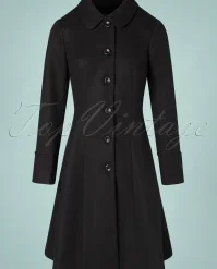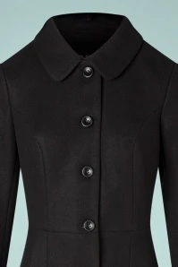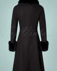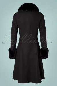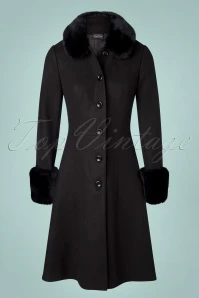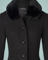 It promises to be a wonderful winter with this 50s Erin Faux Fur Coat in Black in your wardrobe! She features a stylish, removable faux fur collar, long sleeves with detachable fluffy cuffs and handy side pockets. From the waist down she runs into a flared semi-swing skirt, so you can easily wear this coat over your favourite dresses. Made of a sturdy, yet soft, black fabric (doesn’t stretch) that will keep you warm and is fully lined in black. Warm, stylish and versatile… Erin makes you long for those colder days!