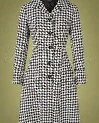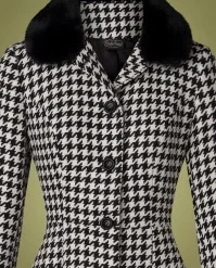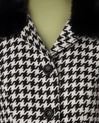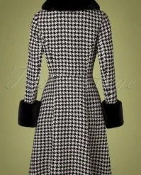 It promises to be a wonderful winter with this 50s Erin Faux Fur Coat in Houndstooth in your wardrobe! She features a stylish, removable black faux fur collar, long sleeves with detachable fluffy cuffs and handy side pockets. From the waist down she runs into a flared semi-swing skirt, so you can easily wear this coat over your favourite dresses. Made of a sturdy, yet supple, woven fabric (doesn’t stretch) in a Houndstooth pattern in ivory white and black and fully lined in black. Warm, stylish and versatile… Erin makes you long for those colder days!