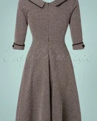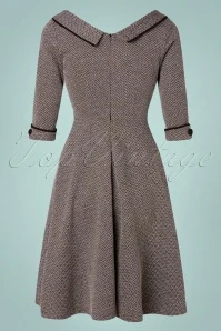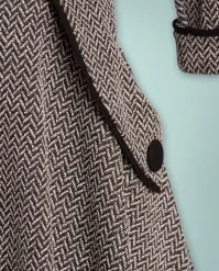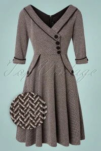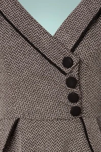 Feel like a vintage beauty in this 50s Marica Herringbone Swing Dress in Grey! She features an eye-catching wide collar that runs into a subtle V-neckline with a playful wrap over and a row of faux buttons made of black fabric, très chic! From the waist down she flows into a flattering swing skirt styled with elegant pockets finished with black piping and decorative buttons, just like the 3/4 sleeves. Made of a thick, yet supple, grey fabric in a classic herringbone pattern and with a light stretch for a lovely fit. Elegance at its best!