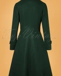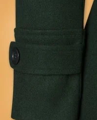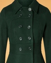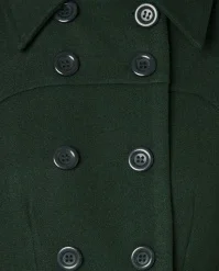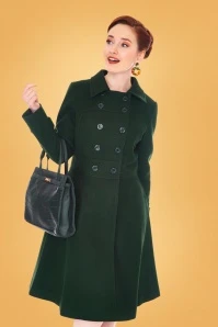 Brave the colder days in style with this 60s Daria Double Breasted Coat in Peacoat Green! A real looker due to her classic double-breasted button closure, her pointy collar and dark-green colour. From the fitted waist band down, she runs into a flattering A-line style. Made of a luxurious, slightly thicker, soft fabric (doesn’t stretch) and fully lined. Elegant and classy, Daria lifts your look to new fashion heights!Â