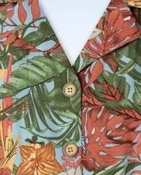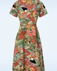This Wild Parrot Swing Dress in Multi is sure to put a smile on your face! A beautiful shirt dress with playful buttons that you will want to wear every day. Her elegant V-neckline, lapel collar, short sleeves and belt create a stunning silhouette to make you look and feel your most feminine. Made of a supple fabric (doesn’t stretch) featuring a colourful design of tropical leaves, toucans and leopards. You are all set for summer with this beauty in your wardrobe!Â